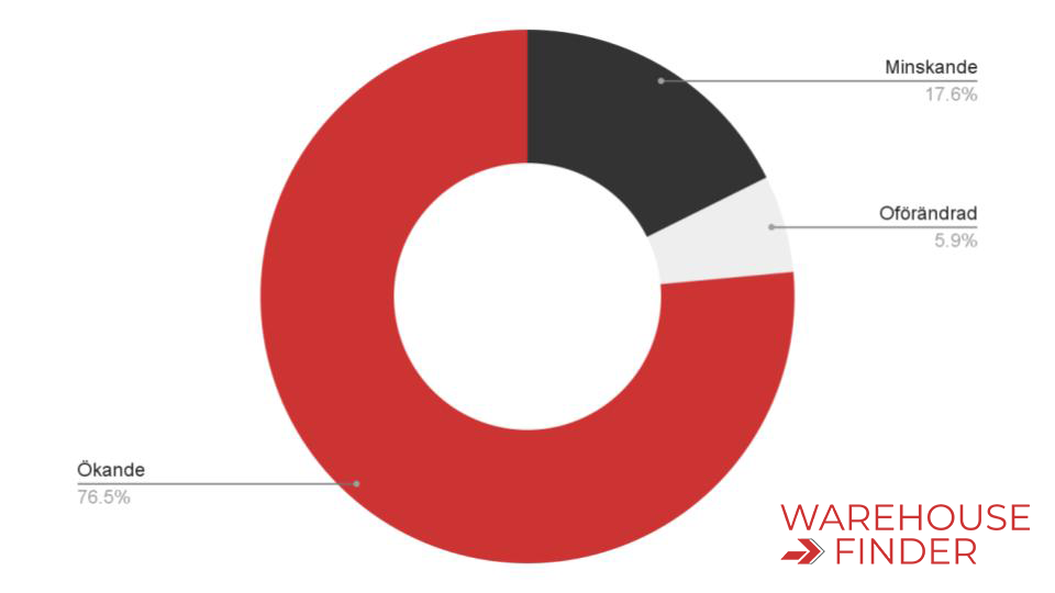 5 av 10 säger att man ökat mängden kunduppdrag under året medan lika många, dvs. ungefär hälften, ser en ökning av förfrågningar om kortare, tillfälliga lagringsuppdrag. Angående storleken av uppdrag fördelas det jämt mellan de som ser en ökning i storlek, en oförändrad situation och att uppdragen verkar vara mindre – dock med en liten övervikt mot att uppdragen blir mindre i volym. Kanske en indikation på att många varuägare börjar få fullt i sina lager? Kopplat till den starka byggnationstrenden av logistikfastigheter verkar det vara en rimlig slutsats.